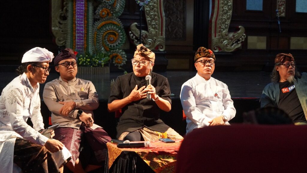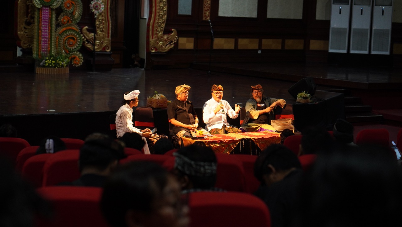 Sedangkan diskusi menghadirkan pembicara Rektor Universitas PGRI Mahadewa Indonesia (UPMI) Bali, Prof. Dr. Drs. I Made Suarta, S.H., M.Hum, dosen ISI Denpasar Dr. I Ketut Kodi, SSP., M.Si., Sanggar Gita Semara Peliatan, I Wayan Sudiarsa, S.Sn., M.Sn., dan Jurnalis budaya Made Adnyana Ole serta dimoderatori oleh Jero Penyarikan Duuran Batur yang bernama lengkap I Ketut Eriadi Ariana. Menariknya, siskusi ini diikuti lebih dari 500 orang terdiri dari siswa dan mahasiswa seni budaya serta masyarakat pecinta seni.