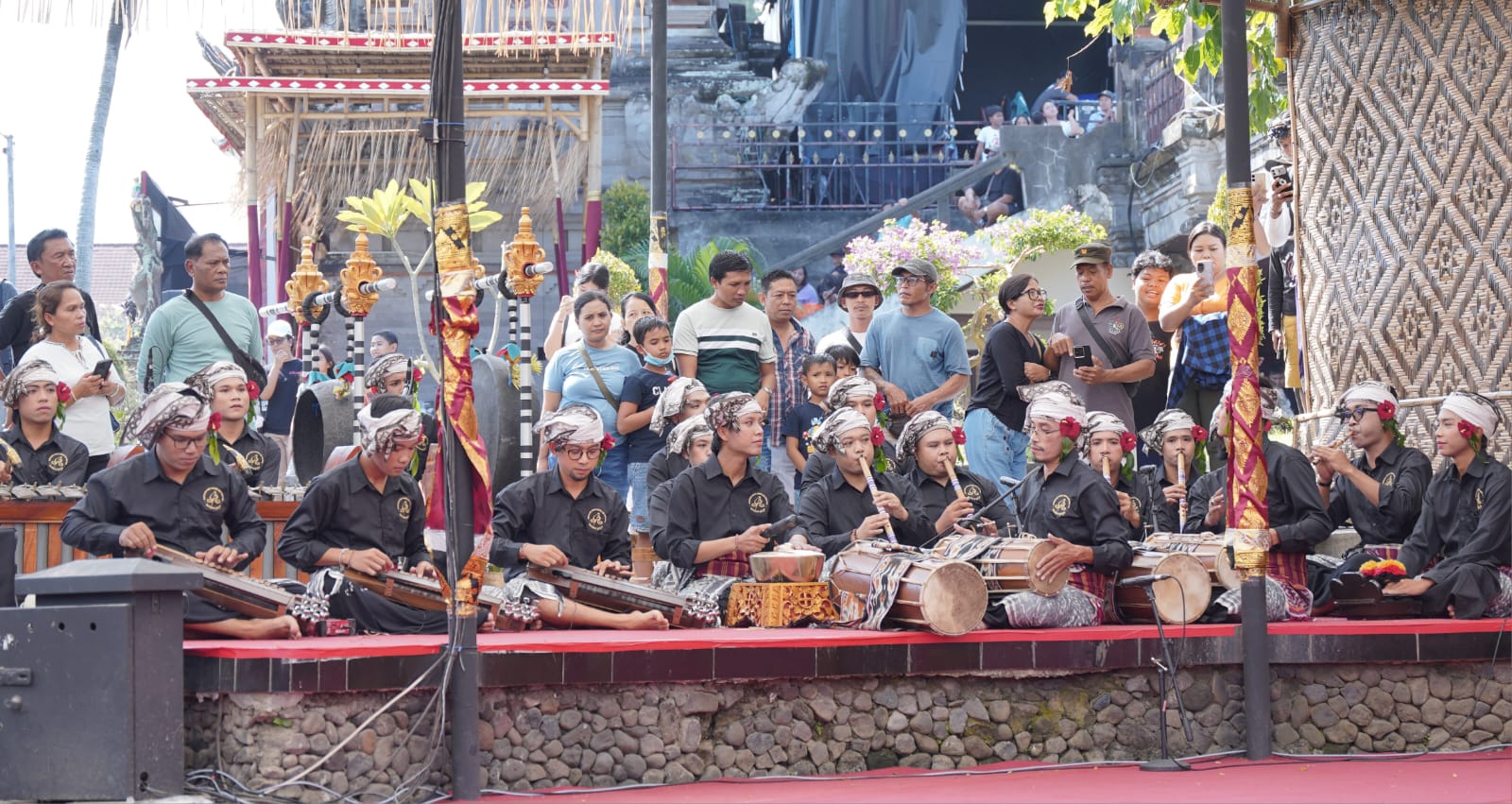 Musiknya adalah gamelan golongan tua dipadu dengan golongan madya yang dijadikan satu dengan esambel-esambel yang cenderung atraktif dan keras. Lalu, dikolaborasikan dengan olah vocal, harmoni, irama, melodi tempo, dan ritme yang memiliki karakter lirih, lembut, gembira dengan olahan bersaut-sautan antara penabuh dan gerong yang diharapkan bisa membuat nuansa baru dalam perkembangan gamelan untuk kedepannya dengan tidak menghilangkan esensi dari pakem yang sudah ada. Sebagai penata adalah I Gede Ari Sugiartana Putra. [T]