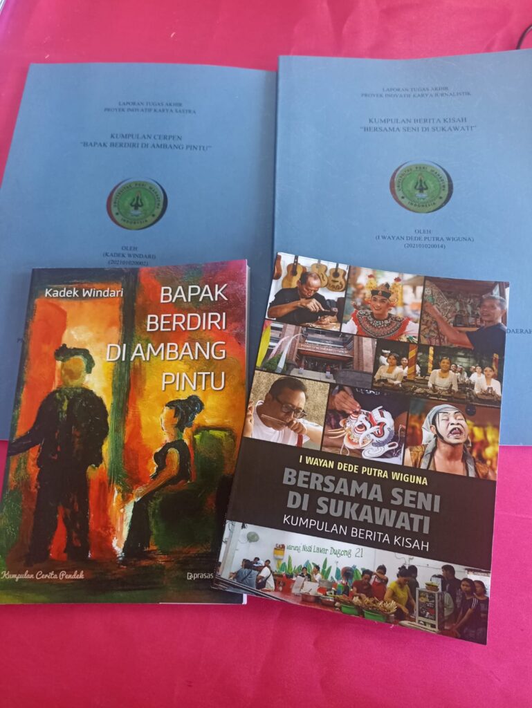 I Wayan Dede Putra Wiguna (22) tidak menyelesaikan kuliahnya dengan menulis skripsi. Ia memilih jalan lain, yaitu menulis buku. Bukan novel, bukan kumpulan puisi, melainkan buku berita kisah (feature) berjudul “Bersama Seni di Sukawati”. Isinya 14 tulisan tentang kehidupan dan kesenian di kampung halamannya, Sukawati, Gianyar.