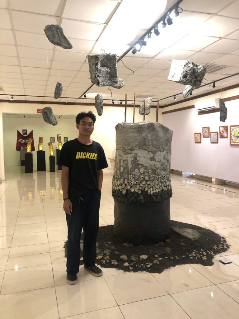 Bayu Beton berdiri di depan karyanya, Surga yang Disemen | Foto: Dok. Panitia