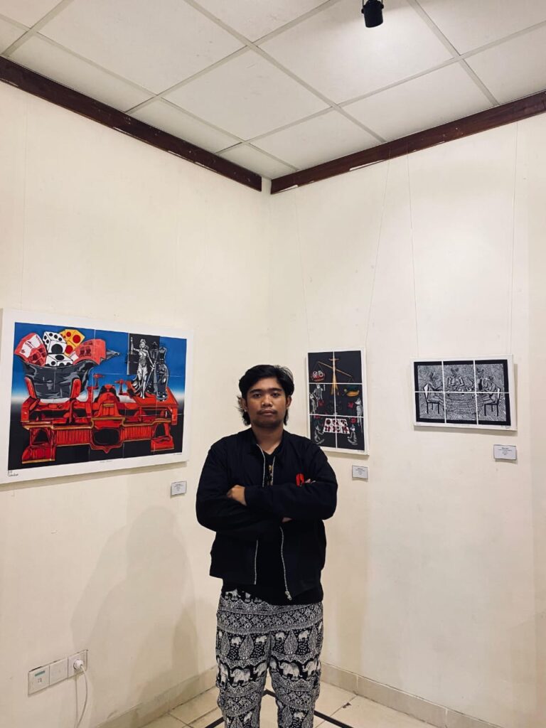 SAYA melihat kemunduran Indonesia dari potongan rusak pembangunan di pesisir dan pesta judi para babi di meja kuasa milik Dolar dan Bayu Beton pada Pameran Studi Khusus Mahasiswa Angkatan 2022 di Galeri Paduraksa FBS Undiksha, Singaraja, Rabu, 9 Juli 2025.