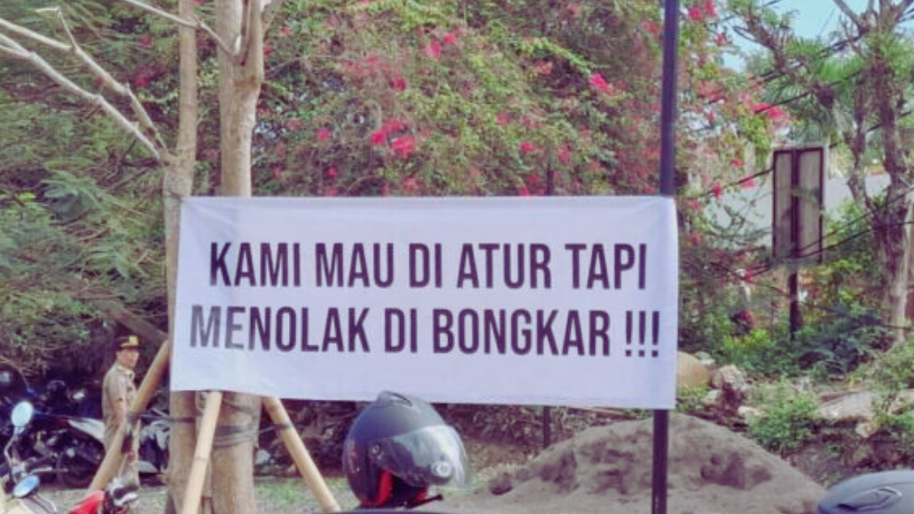 Spanduk penolakan pembongkaran bangunan di Pantai Bingin | Foto diambil dari Balitopik.com