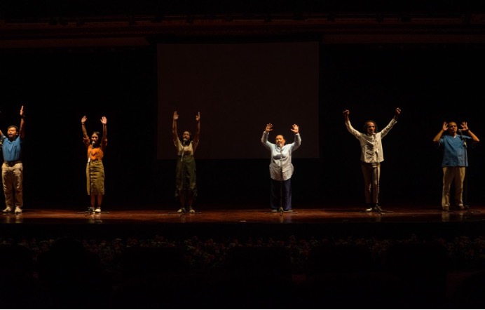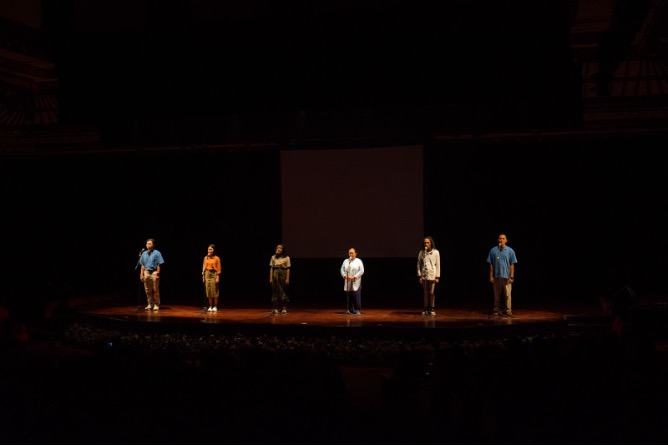 Para aktor memasuki panggung, berdiri di balik pelantang suara. Mereka adalah Putri Lestari (Yogyakarta), Silvy Chipy (Maumere), dan Adi Gunawan, Don Rare, Mas Ruscitadewi, Kadek Eky Virji (Bali). Sebelum kata pertama terucap, tubuh-tubuh mereka sudah bersuara. Kostum kasual yang mereka kenakan seperti mempresentasikan karakter personal masing-masing.