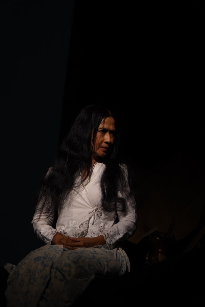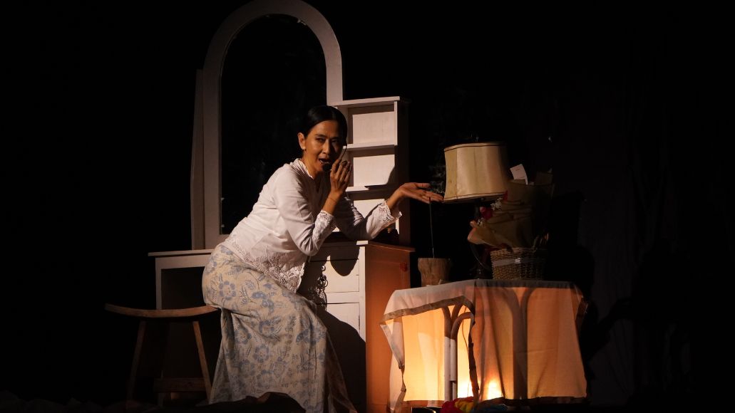 IA memasuki panggung dengan balutan pakaian serba putih. Di atas panggung ada meja rias (yang juga berwarna putih), dupa, alat musik tradisional, lampu tua yang temaram, dan beberapa alat peraga lainnya (set property dan hand property)—yang mendukung pementasan. Panggung yang biasanya penuh cahaya, kini menjelma remang yang magis. Suasana itu mencipta tafsir yang ganjil. Kemuraman, kepasrahan, kesembuhan, harapan, bercampur-aduk menjadi satu.