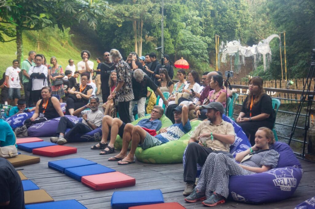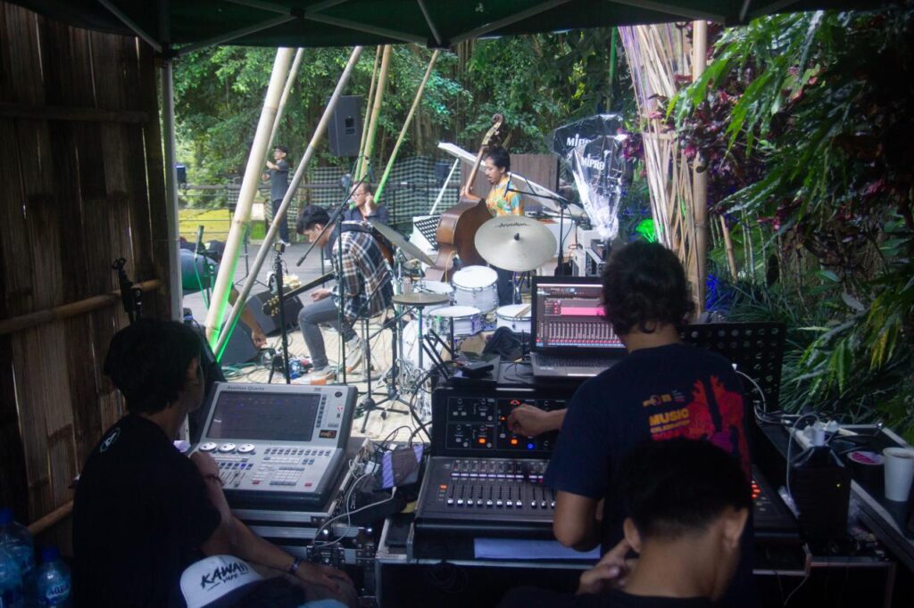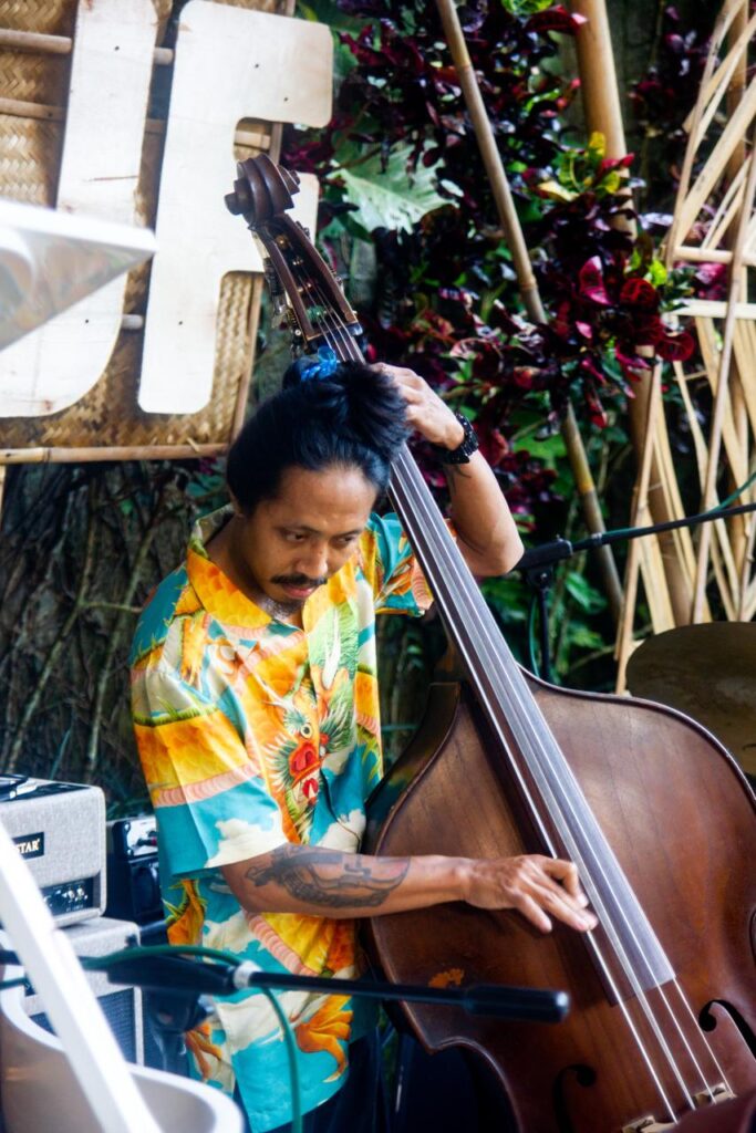 Dan malam itu, alam pun seakan ikut bergabung. Di belakang panggung, suara deras air sungai Lodtunduh menyusup ke telinga penonton, berpadu dengan senar gitar dan kayu bass. Bukan efek, bukan sound design, hanya suara dunia yang kebetulan selaras dengan musik. Jazz seperti ini jarang terjadi: bukan hanya dimainkan, tapi juga dibiarkan terjadi bersama semesta.