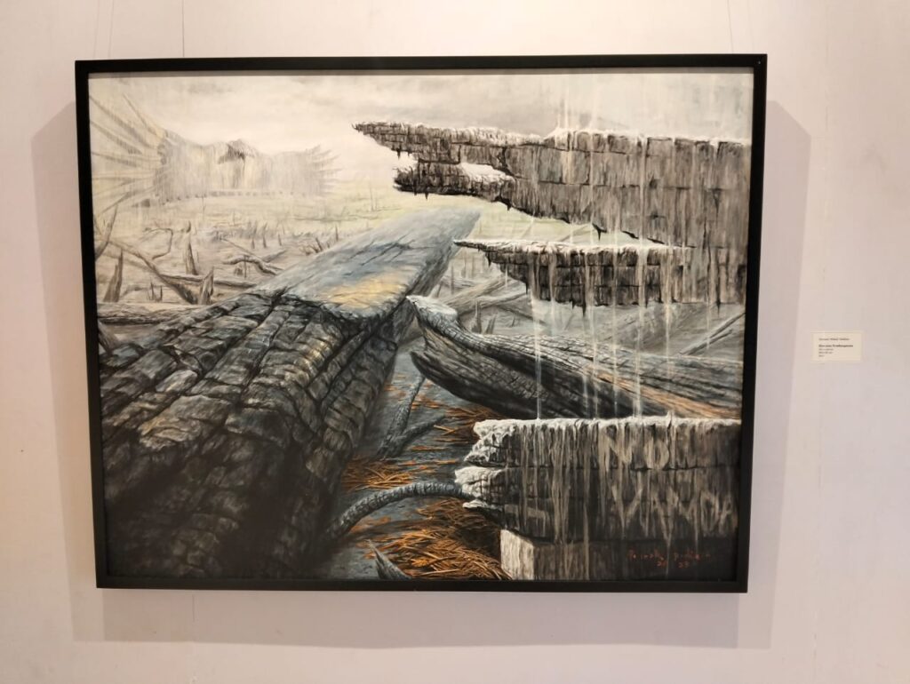 Kemudian pada karya Polenk Rediasa yang kedua berjudul Sisa-sisa Pembangunan (2023), oil on canvas ukuran 100×120 cm itu, seperti petunjuk yang bisa mengantarkan si pengunjung untuk tahu, apa yang membuat tanah menjadi botak gersang. Untuk tahu bahwa semua itu adalah pembangunan.