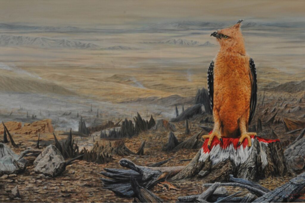 (1) Awas Sigap, lukisan yang menyimpan narasi pedih di balik simbolisme heroik. Garuda yang gagah mencengkeram merah-putih justru menjadi ironi di tengah panorama kehancuran alam yang mengelilinginya—hamparan tanah gersang dan pepohonan yang menjadi korban api tak sekadar bencana, melainkan buah kebijakan buta dan keserakahan oligarki.