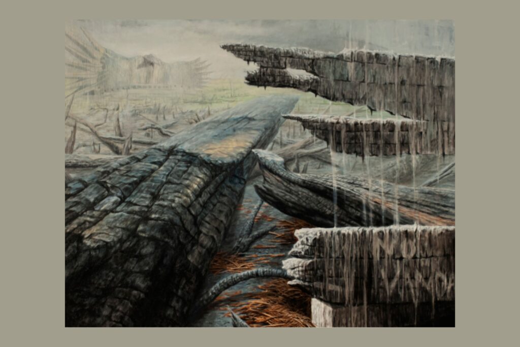 (2) Sisa-sisa Pembangunan, lukisan ini merekam jejak pembangunan besar-besaran yang mengorbankan alam. Reruntuhan kayu hangus dan tunggul pohon yang patah mendominasi kanvas, sementara di kejauhan, siluet megah sebuah proyek pembangunan tampak samar.