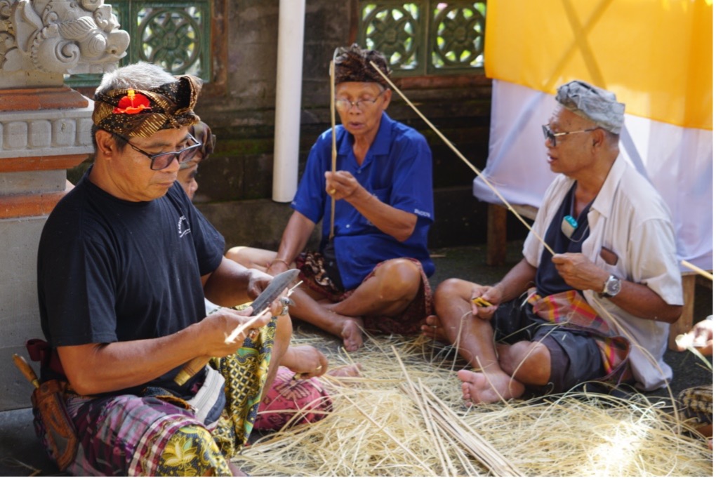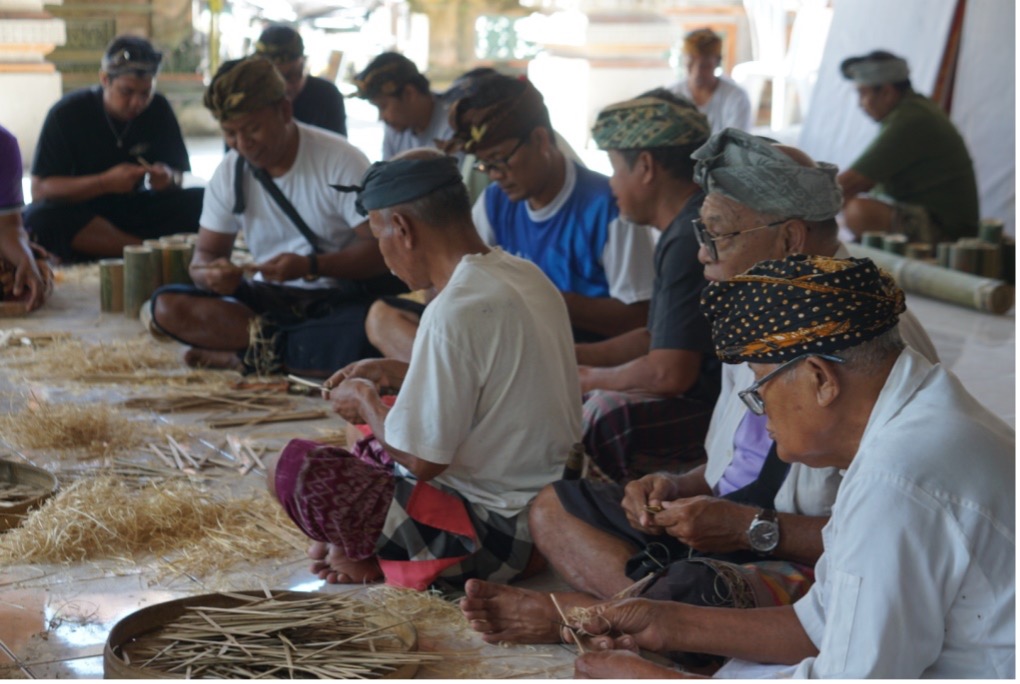 Krama Lanang Banjar Adat Ubud Kaja ngayah membuat katik sate dari bahan bambu di Bale Banjar Ubud Kaja | Dok. Tim Media Ubud Kaja