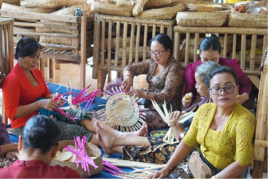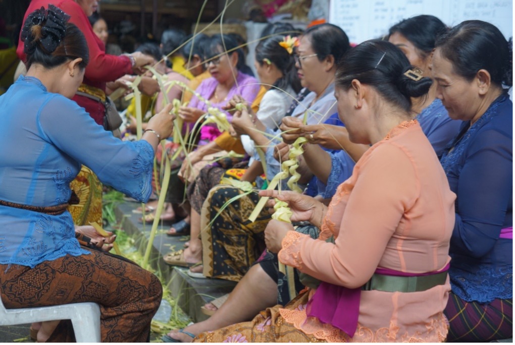Krama Istri Banjar Adat Ubud Kaja ngayah membuat sarana upacara dari rangkaian janur di Bale Banjar Ubud Kaja | Dok. Tim Media Ubud Kaja