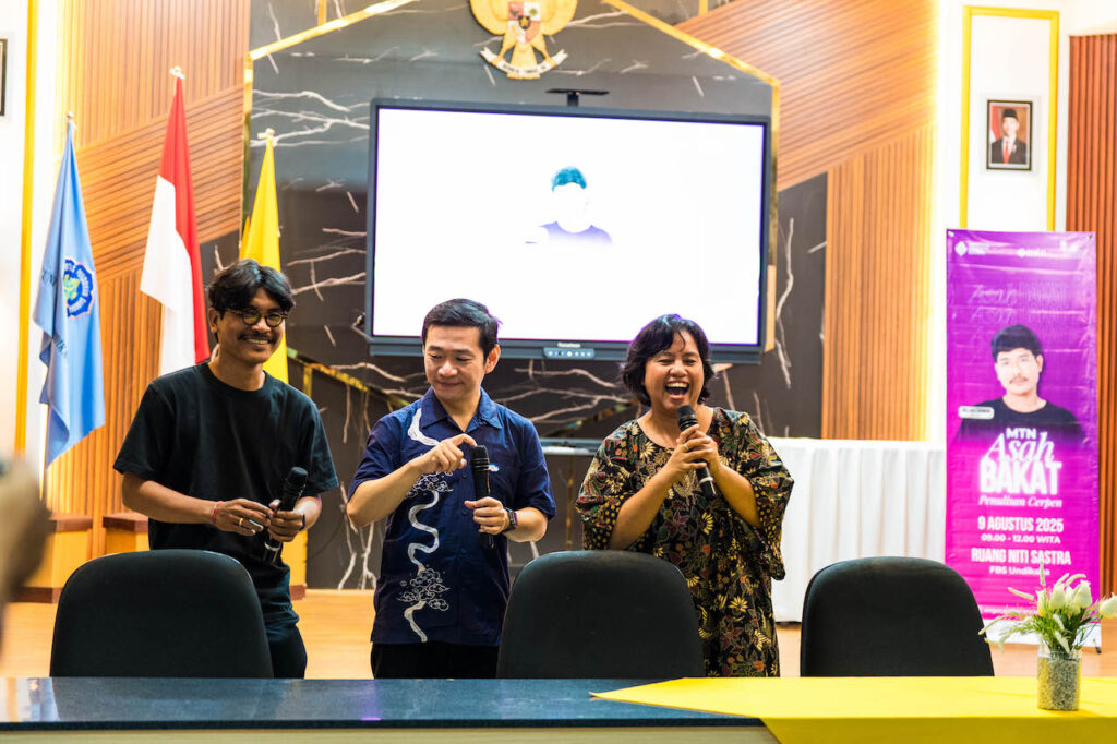 Juli Sastrawan, David Irianto (tim MTN Kementerian Kebudayaan RI) dan Kadek Sonia Piscayanti (Pendiri dan Direktur SLF) saat membuka acara MTN Asah Bakat di kampus Undiksha Singaraja | Foto: Tim SLF 2025