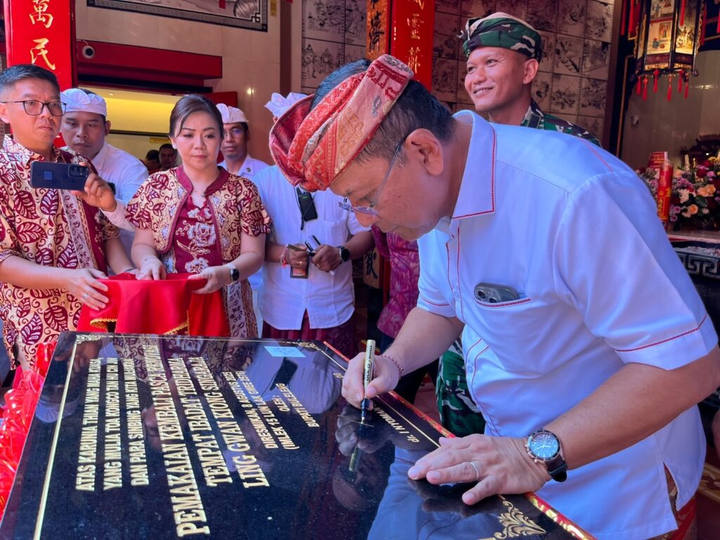 Bupati Nyoman Sutjidra menandatangani prasasti peresmian TITD Ling Gwan Kiong setelah restorasi di Pelabuhan Tua Buleleng