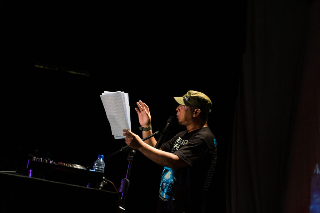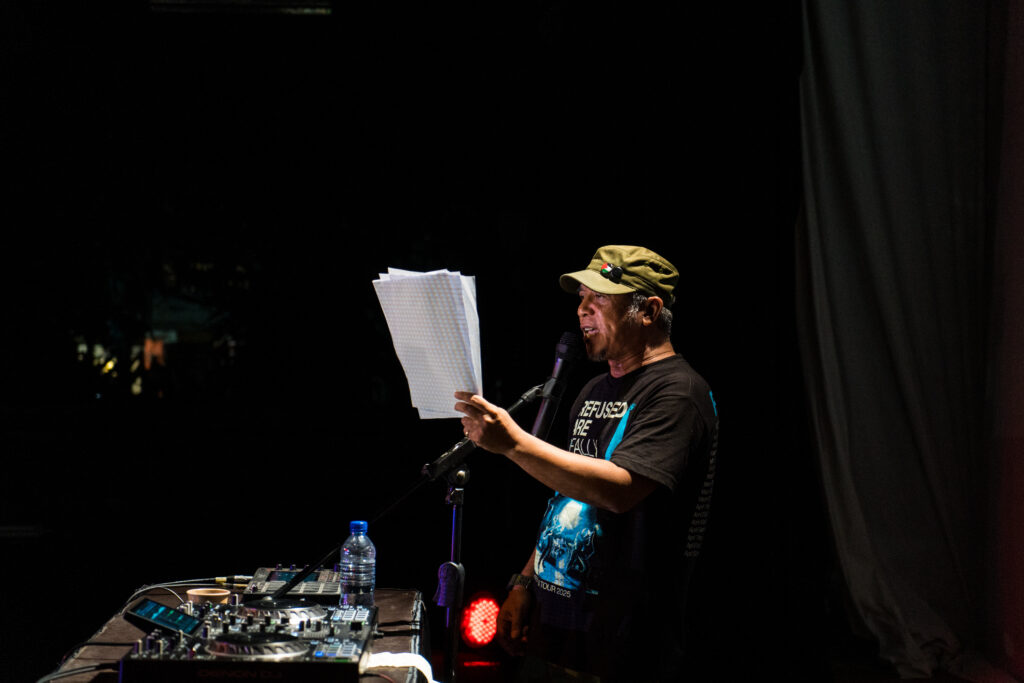 Banyak sajak dihujamkan malam itu, salah satunya berjudul “Jeruji”. Kata-kata yang terdengar seperti tusukan demi tusukan yang menelusuri luka sosial dan politik. Ia menggaungkan tentang generasi yang mungkin hanya akan menjadi “pabrik”, tentang masa depan yang penuh tirani. Setiap barisnya disampaikan dengan nada geram yang tak sekadar lantang, tapi berat juga, bak batu yang dilempar tepat ke tengah arus.