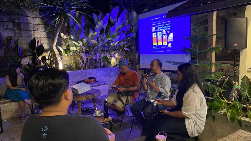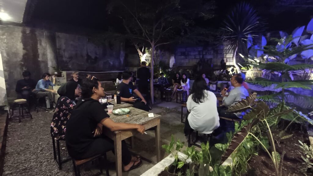 Yuswinardi (kiri depan) dan saya (tengah) pada diskusi film Legiun Tulang Lunak – 20 Centimeters Per Year di Kedai Umah Pradja Singaraja | Foto: Singaraja Menonton