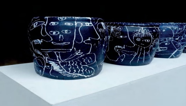 Ada juga karya yang membuat saya berhenti sejenak dan melihat, begitu unik karya ini. Sebuah karya instalasi Neomesolitikum karya dari Ni Komang Atmi Kristia Dewi. Dibuat dengan media gerabah, cermin, dan batu pantai. Gerabah yang di cat biru dan di beri gambaran manusia purba, di dalam gerabah itu ditempelkan sebuah cermin bulat dan diberi sepotong batu-batu pantai kecil. Jarang saya melihat karya seperti itu, terlihat begitu unik di mata saya. K