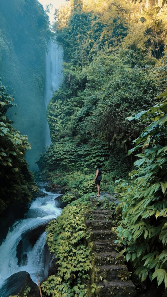 Bebatuan besar di kaki air terjun seperti tahta alami, sebagian terselimuti lumut halus. Ada sebuah jembatan kayu melintas di salah satu sisi, agak renta, dengan beberapa papan yang mulai goyah. Menurut Komang Ayu, jembatan itu akan segera diperbaiki.