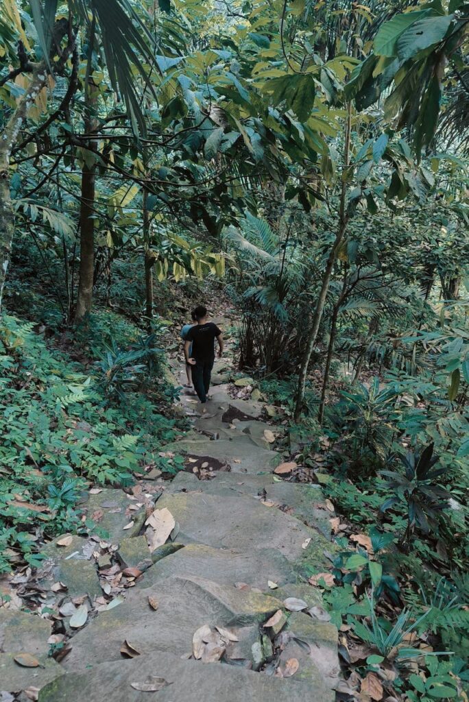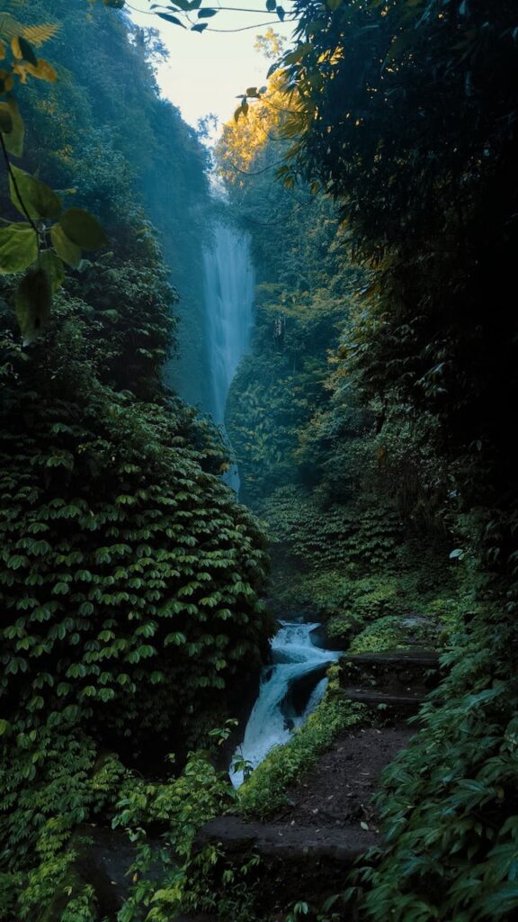 Jalan menuju air terjun dimulai dengan menurun, di kanan terlihat pemandangan bukit, di kiri tebing yang ditumbuhi beberpa pepohonan jaka, cengkeh, dan rumpun-rumpun salak,. Pohon-pohon ini bukan sekedar hiasan alam, tapi bagian dari denyut ekonomi warga, menunggu masa panen pengepulnya. Tangga dari batu alam disusun rapi memandu Langkah, tapi licinnya lumut memaksa setiap pijakan dilakukan dengan kesadaran penuh.