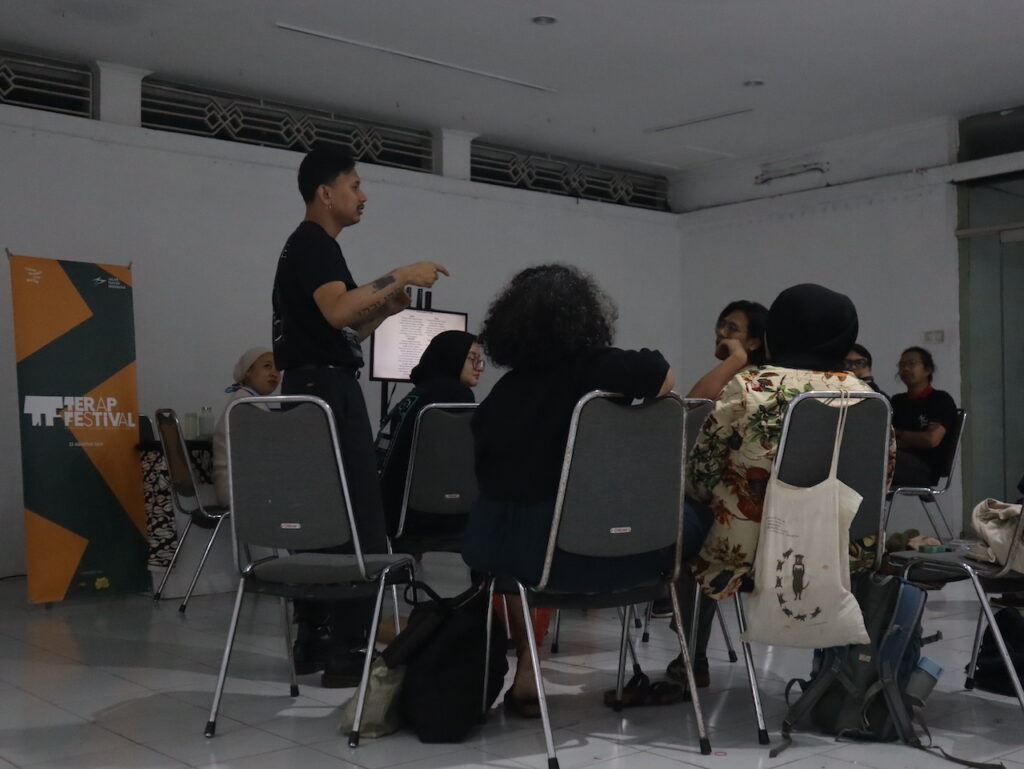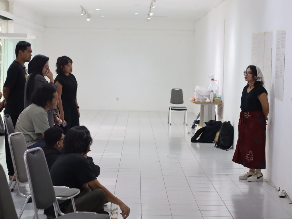 Sesi fasilitasi inkubasi seniman: ruang berbagi pengetahuan, menggali pertanyaan kritis, sekaligus membangun etika kolaborasi yang menjadi dasar festival | Foto: Adi Pirmansyah