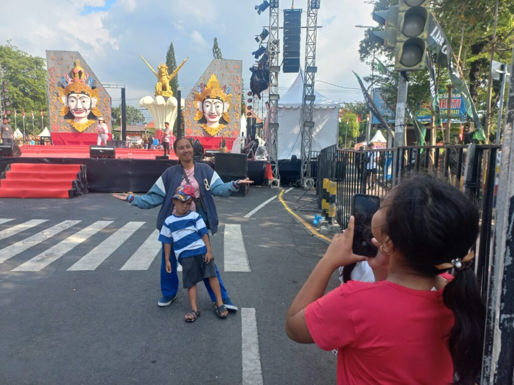 Saat siang hari, suasana terik matahari menyengat, tak menyurutkan semangat mereka untuk berfoto di depan dua topeng besar itu. Kesempatan untuk berswafoto hanya terbuka dari pagi hingga menjelang senja, karena selepas itu, panggung sudah milik artis atau seniman yang pentas, dan lautan manusia akan membanjiri kawasan festival hingga malam tiba.