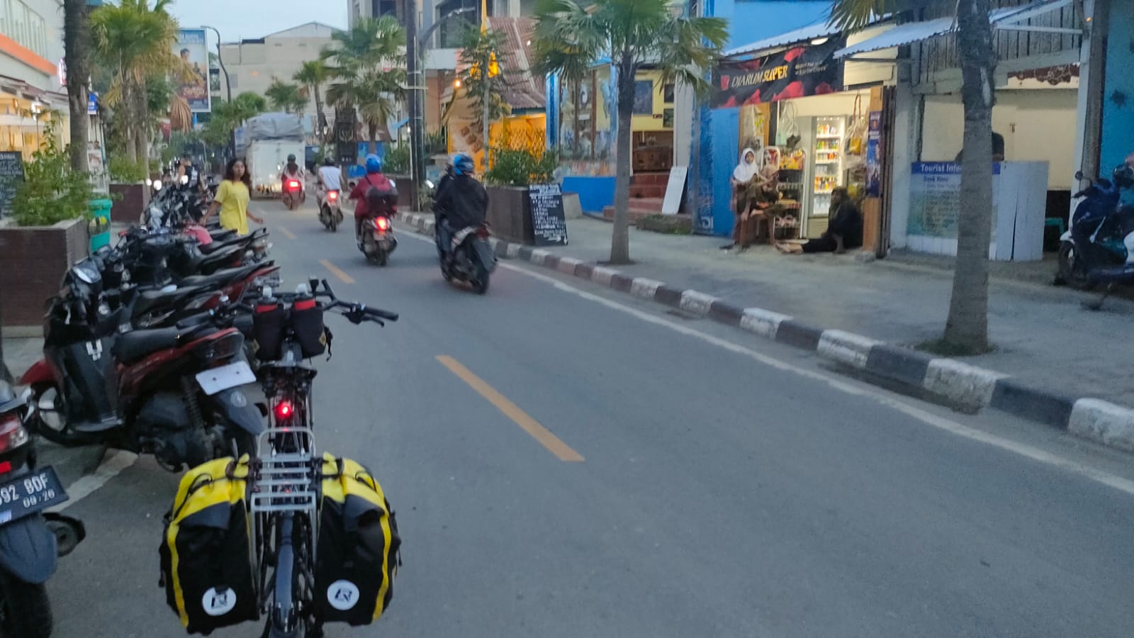 Sepeda saya kayuh pelan sambil menikmati suasana objek wisata tepi pantai itu. Suasananya tidak jauh berbeda dengan objek wisata tepi laut pada umunya, yang dikunjungi wisatawan mancanegara. Sepanjang jalan terdapat banyak hotel, restoran, bar, kedai kopi dan jasa diving.