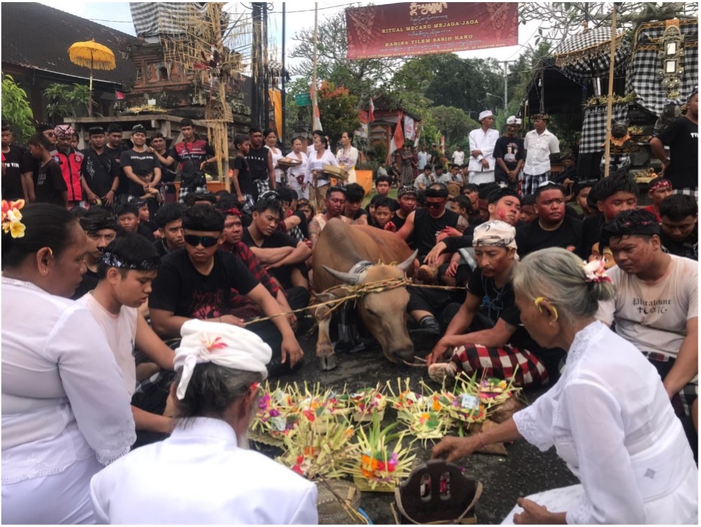 Setelah semua persiapan sudah siap, ritual dimulai pada pukul 07.00 WITA ketika sapi dimandikan, lalu dibawa menuju Pura Paseh untuk memanjatkan doa bersama, memohon agar upacara berjalan lancar serta desa dianugerahi keselamatan. Setelah prsesi doa, sapi ditebas pada bagian pantat menggunakan blakas sudamala dan darahnya dibiarkan menetes sebagai sarana pensucian sekaligus permohonan keselamatan.