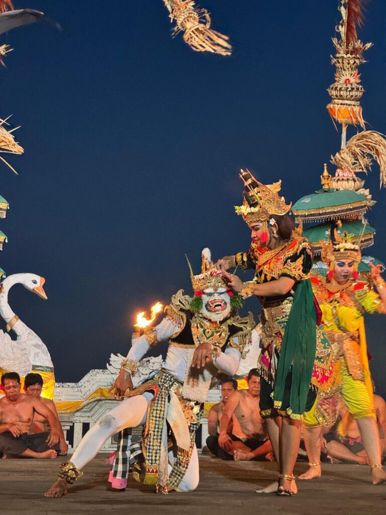 Saya bertanya apakah ia pernah menari di kawasan Garuda Wisnu Kencana (GWK)? Ia menjawab, “Aduh, sudah bosan, berapa tahun sudah itu. Belasan tahun menari di situ. Sebelumnya saya menari di hotel-hotel, dari Bali Jimbaran, Nusa Dua, sampai ke Pecatu. Makanya sudah berpuluh-puluh tahun Kecak di sini, dari zaman Hotel Bali Cliff tahun 1993 berdiri.”
