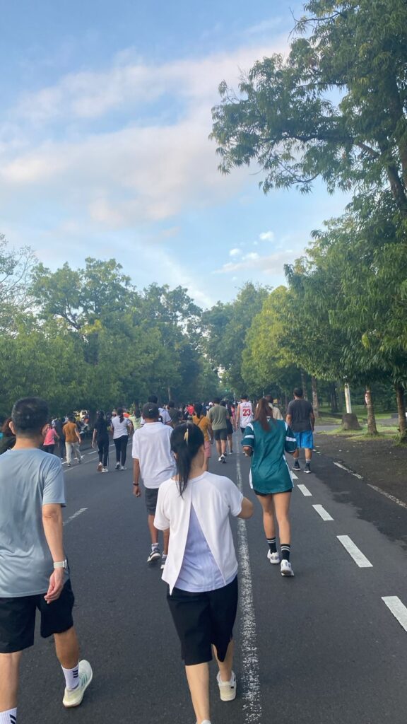 Orang-orang lalu-lalang di jalanan tanpa kendaraan. Orang-orang joging mengelilingi lapangan. Orang berlari-lari kecil, ada juga yang cukup kencang. Anak-anak, remaja, hingga orang tua, berolahraga santai di lapangan.