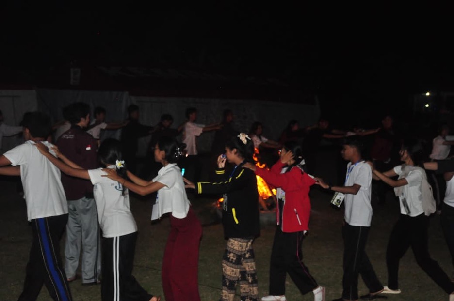 Ketika sore berganti malam, api unggun menyala di tengah halaman, para peserta pun berdiri melingkar. Cahaya dari kobaran api membuat suasana semakin hangat. Malam itu diisi dengan pentas seni. Setiap kelompok tampil bergiliran: ada yang menampilkan teater, ada pula yang menyanyikan lagu bersama. Riuh tepuk tangan dan sorak-sorai mengiringi keseruan malam itu.