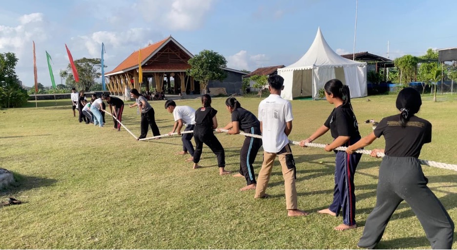 Sorakan riuh dari peserta menambah semangat kelompok yang berjuang menarik tali sekuat tenaga. Ada yang jatuh, ada yang tergelincir, namun tetap berjuang untuk bangkit, semuanya berlangsung dalam semangat kebersamaan. Menjelang siang, kegiatan ditutup dengan evaluasi, pembagian sertifikat, dan sesi foto bersama.