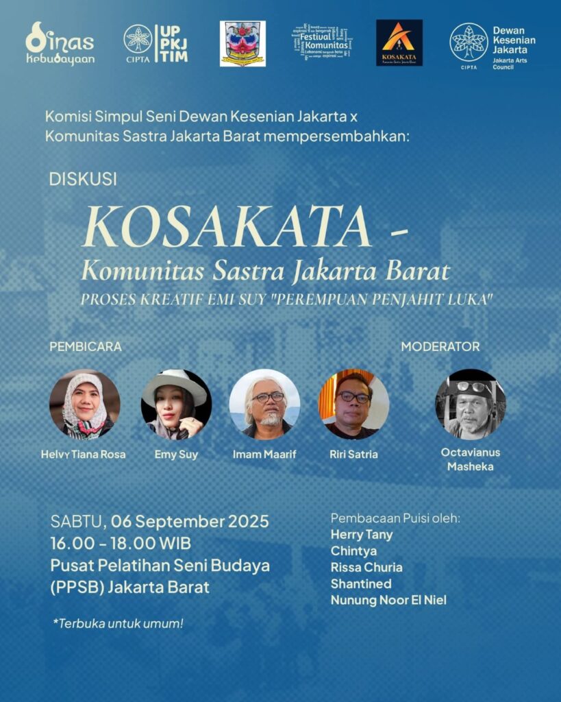 Tulisan ini adalah sejumlah catatan dari acara Diskusi Kosakata: Proses Kreatif Emi Suy – “Perempuan Penjahit Luka” menghadirkan tokoh-tokoh sastra dan budaya yang akan menuntun audiens menyelami dunia puisi.