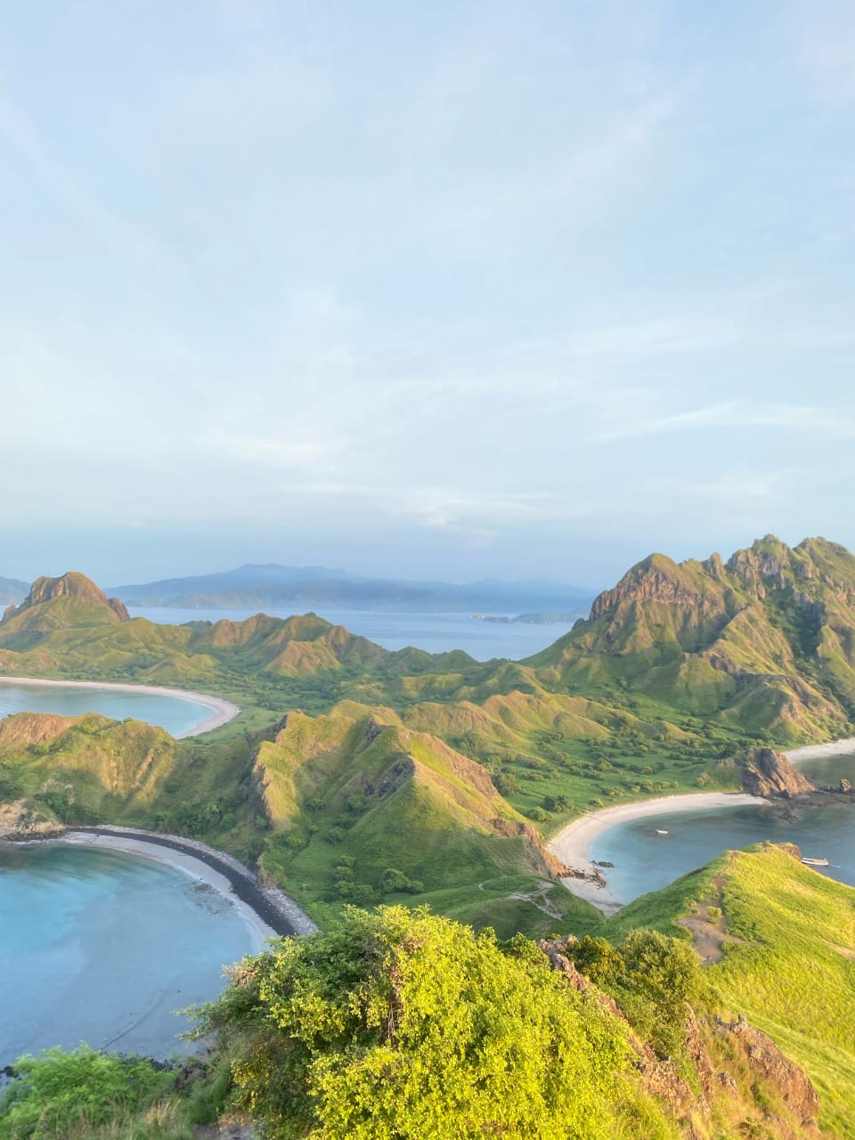 Perjalanan dilanjutkan ke Pulau Padar, ikon wisata Manggarai Barat dengan lanskap bukit hijau yang melingkar memeluk tiga teluk berpasir berbeda warna. Dari puncaknya, panorama laut Flores terhampar megah.