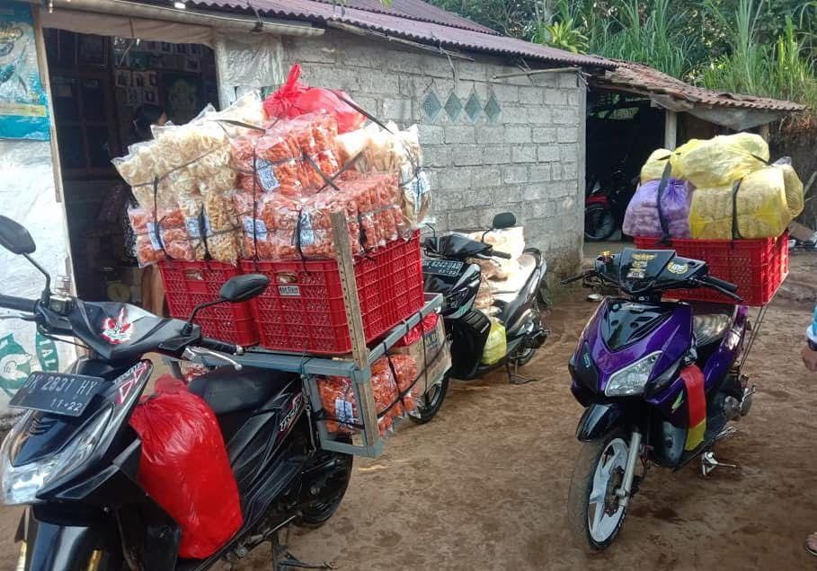 Setiap Selasa dan Kamis, Putu Arnaya bersama istrinya berkeliling mengantar camilan ke warung-warung kecil di sekitar desa. Produk mereka dijual dengan harga terjangkau, mulai Rp 9.000 per pak isi 12 bungkus.