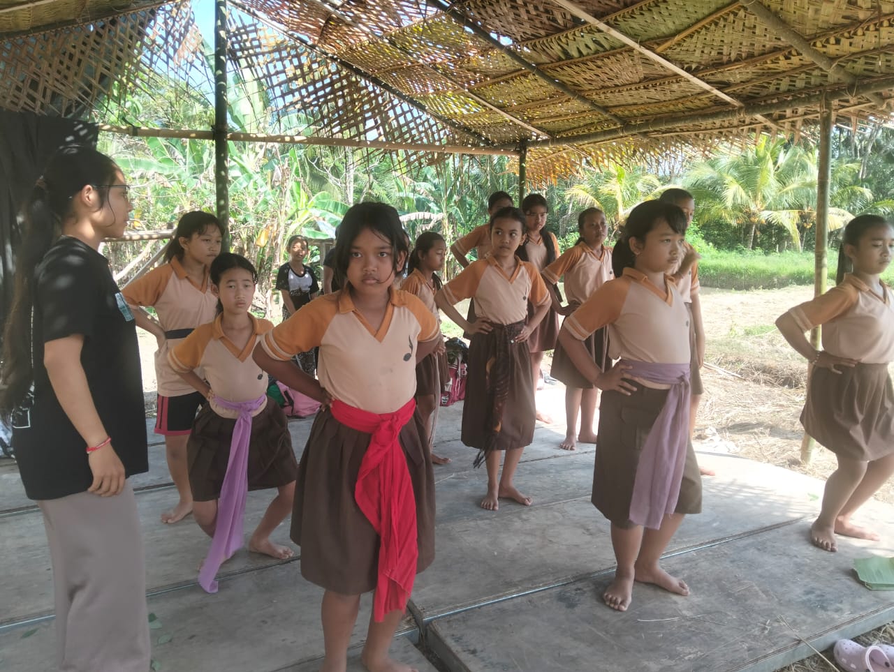 Para peserta, yang seluruhnya adalah anak-anak yang masih duduk di sekolah dasar, diajarkan beberapa gerak dasar tarian oleh Nyoman Budarsana dan Ni Kadek Dwipayani