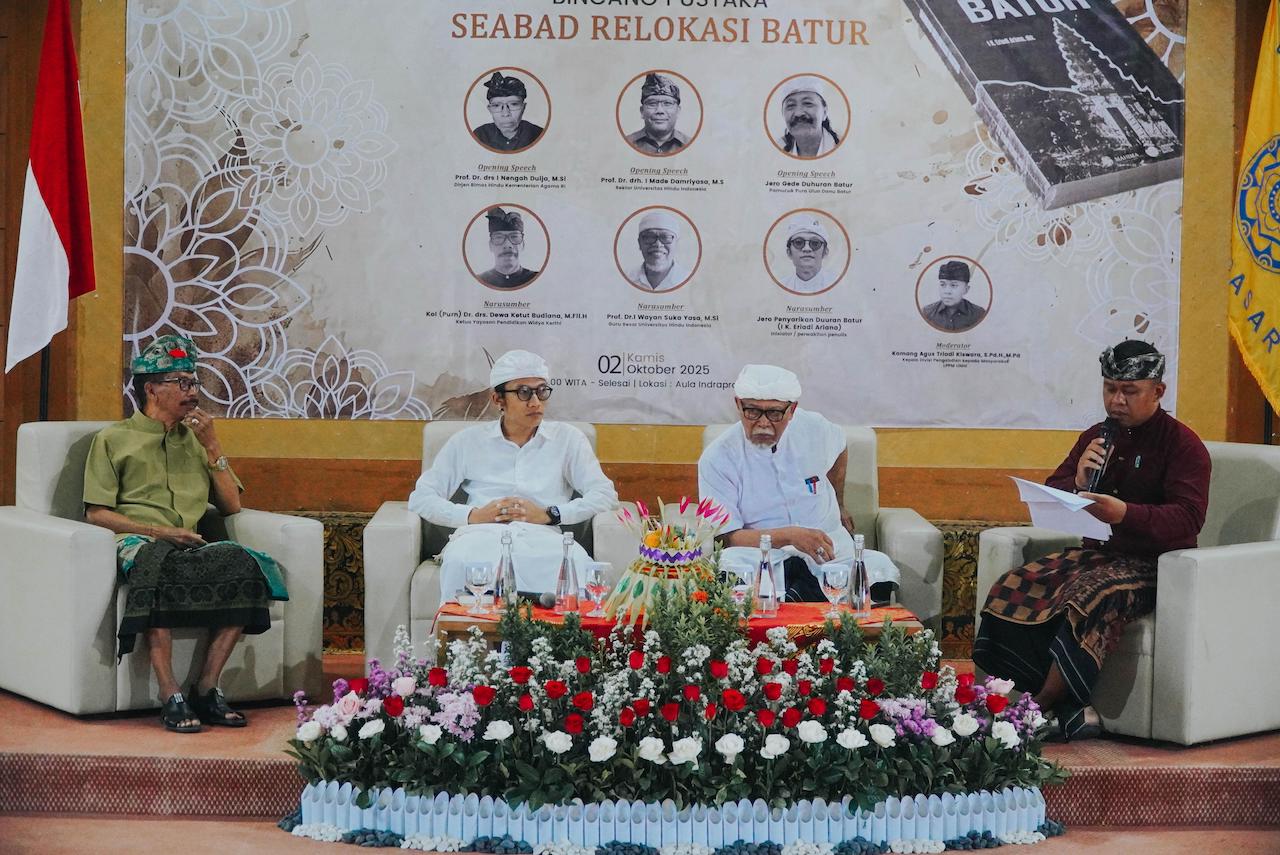 UNIVERSITAS Hindu Indonesia mengadakan “Bincang Pustaka” serangkaian Dies Natalis ke-62 Kamis 2 Oktober 2025 di Aula Indraprasta Gedung Rektorat UNHI. Pustaka yang dibahas sangat menarik yakni Buku Bunga Rampai berjudul Seabad Relokasi Batur. Setidaknya 26 penulis terlibat dalam buku ini.