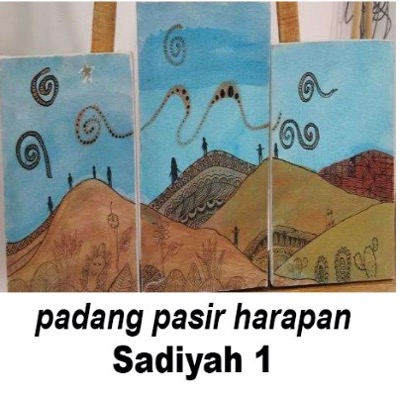 Dalam karya tiga panel ini, Sadiyah menghadirkan lanskap gurun yang bukan sekadar ruang kosong atau tandus, melainkan medan harapan yang dipenuhi motif, jejak, dan narasi visual.