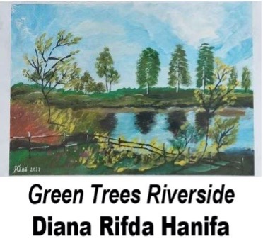 Yang juga cukup produktif berikutnya adalah Diana Rifda Hanifa dengan 8 karya rupa dan 3 buah buku. Saya tertarik dengan karyanya yang bertajuk Green Trees Riverside. Di antara hijau yang tak bersuara dan langit yang mengalir pelan, Diana Rifda Hanifa menenun lanskap yang bukan sekadar pemandangan.