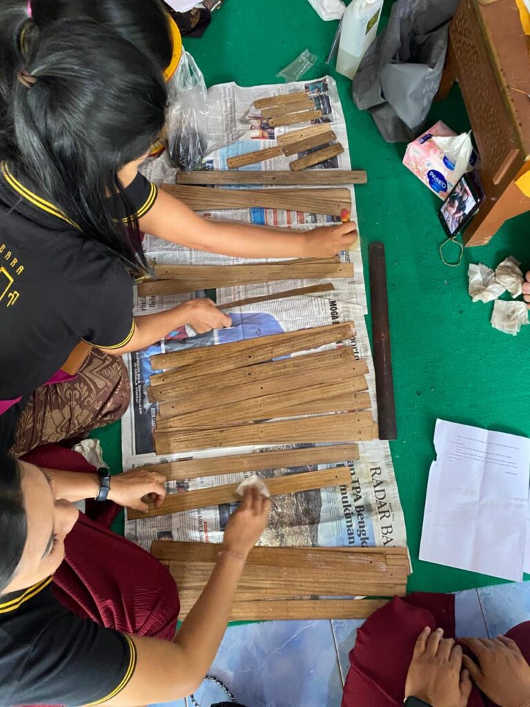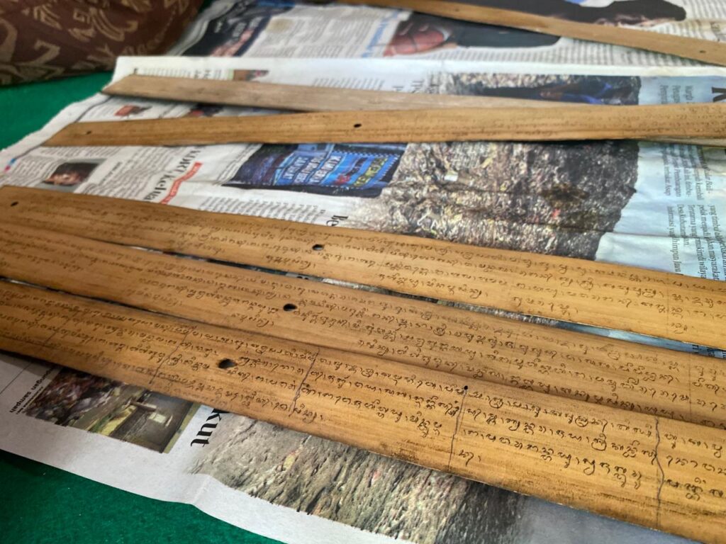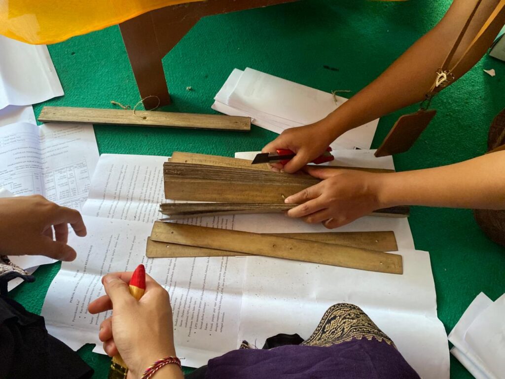 “Pertama kita buka dulu lontarnya, lihat kondisinya. Kalau tulisannya mulai pudar, kita isi tingkih supaya lebih jelas,” kata I Wayan Sutapayasa, Koordinator Baga Lontar Kecamatan Sukasada.