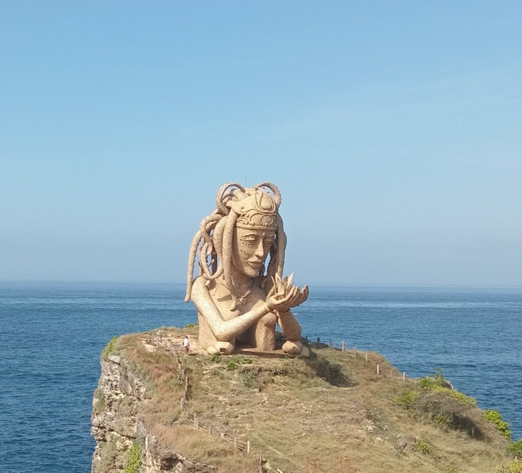 Patung anyaman bambu terbesar di Indonesia yang tercatat dalam Rekor MURI itu berdiri dengan gagah di atas tebing karang di kawasan Broken Beach (Pasih Uug), Desa Sakti, Nusa Penida, Klungkung, Bali. Dengan latar lautan luas, wajah patung itu menghadap ke utara, seolah sedang memantau daratan Bali.