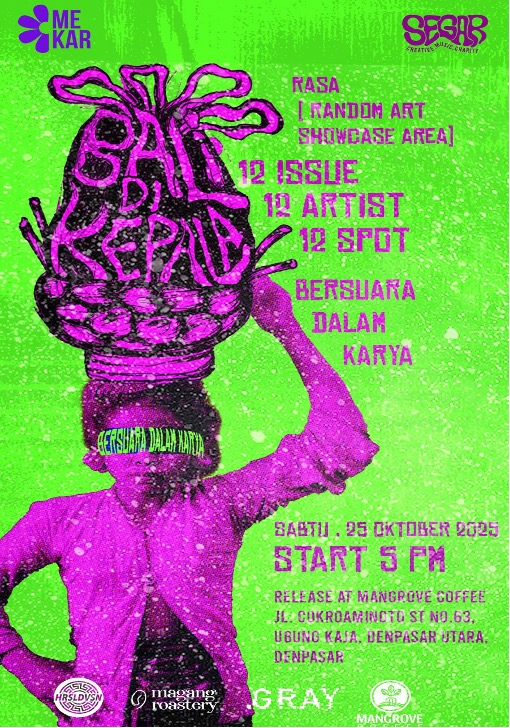 SEGAR Event yang berkolaborasi dengan Merekam Karya pada 25 Oktober 2025, bertempat di Mangrove Coffee Denpasar Utara, telah menghadirkan sebuah inisiatif kreatif yang inovatif melalui tema “Bali di Kepala: 12 Issue, 12 Artist, 12 Spots.” Acara ini bukan sekadar pameran seni, melainkan sebuah platform refleksi yang mengangkat isu isu penting yang tengah menerjang Bali, dikemas melalui karya 12 seniman dengan pendekatan dan gaya yang beragam, serta dipamerkan di 12 lokasi dengan konsep RASA (Random Art Showcase Area) yang di rencanakan tersebar di bebrapa wilayah di Bali.
