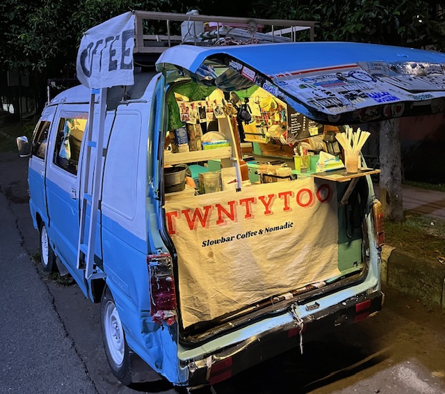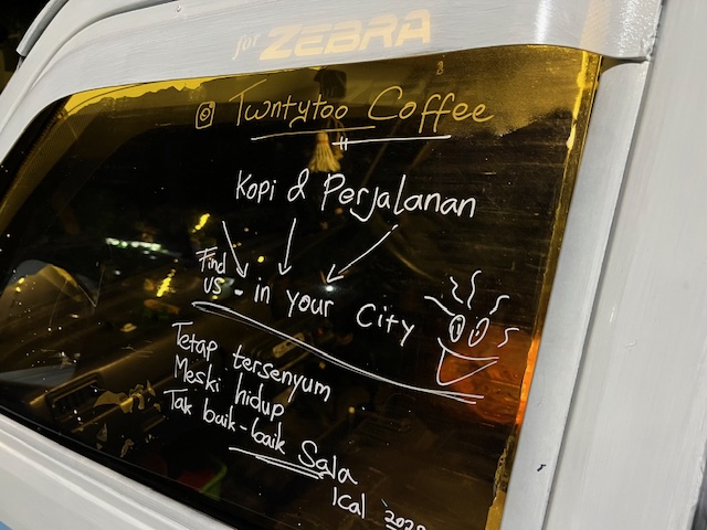 Nama kedai kopinya, Twntytoo Coffee. Di atas mobil tuanya, ical bercerita tentang mengapa ia memilih meninggalkan kampung halamannya untuk mengembara sambari berjualan kopi dengan cara berpindah ke satu tempat ke tempat lainnya.