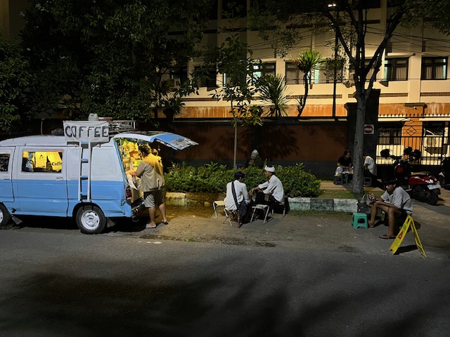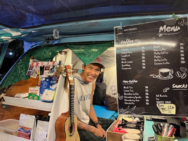 Di tepi jalan itu, Faisal sedang jenak untuk berjualan kopi. Ia berjualan dengan menggunakan mobil. Kok bisa berjualan di Singaraja?