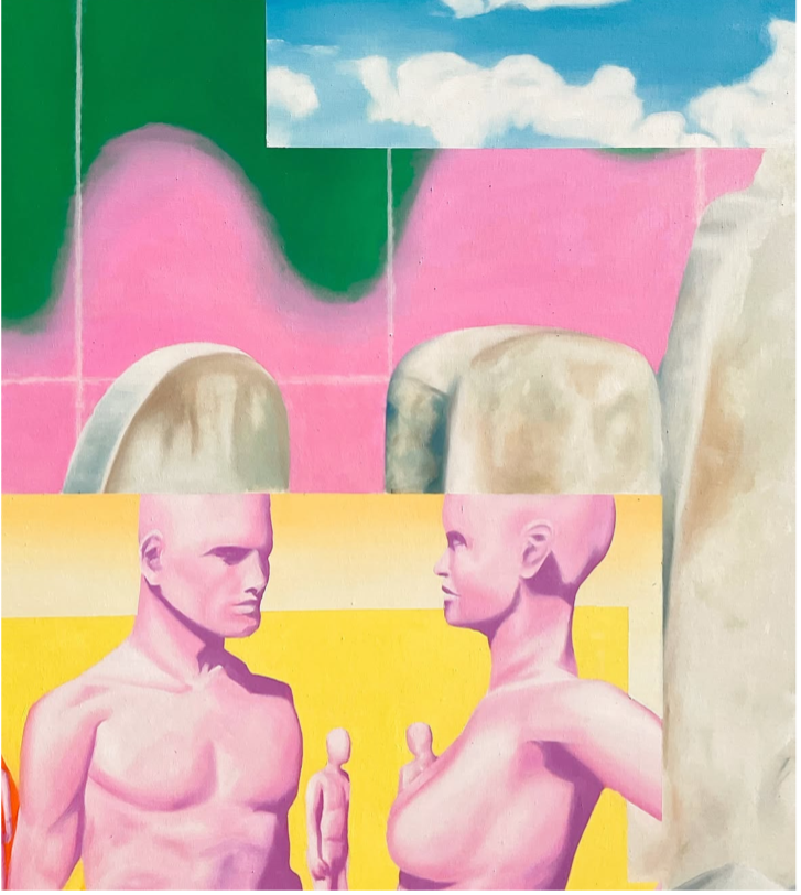 Lihat karya Ilham Karim dan Hudan Seltan misalnya. Dua karya seniman muda tersebut memiliki keterhubungan narasi, yang terlihat dari bagaimana mereka menghasilkan karya mereka. Karya Ilham karim umpamanya, ia seakan berusaha menggambarkan rasa keterasingan, kehilangan dan makna kehadiran dengan warna-warna jenuh dan disorsi kromatik. Ia seolah berusaha menjembatani kegelisahan Gen-Z yang sering merasa lelah dan jenuh dengan tumpukan notifikasi dan informasi yang tiada henti. Dalam hiruk pikuk algoritma yang terasa asing, ia mengajak kita untuk berhenti sejenak, dan melepaskan diri dari kemelekatan dunia digital yang sering kali menuntut kita untuk harus terkoneksi.