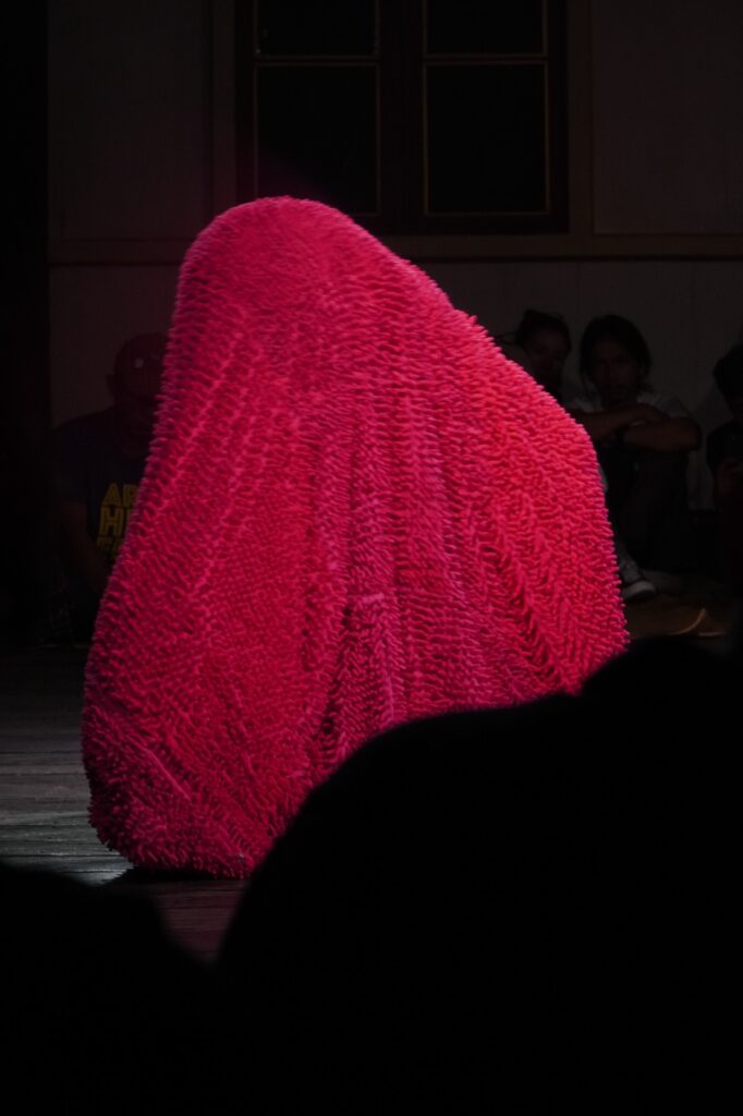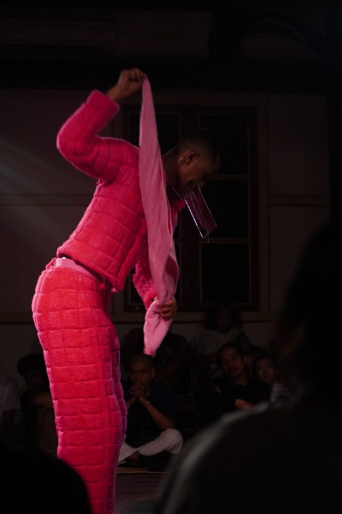 RAZAN masuk ke dalam kain persegi merah muda (“aneh) yang menyerupai sarung kasur beritsleting dan berbulu tebal. Ia lalu beringsut ke panggung pementasan dengan merangkak, berguling, merayap, hingga mengesot dengan pola persegi—dengan diselingi berbagai gerak lainnya. Sebagai penonton awam, saya garuk-garuk kepala.