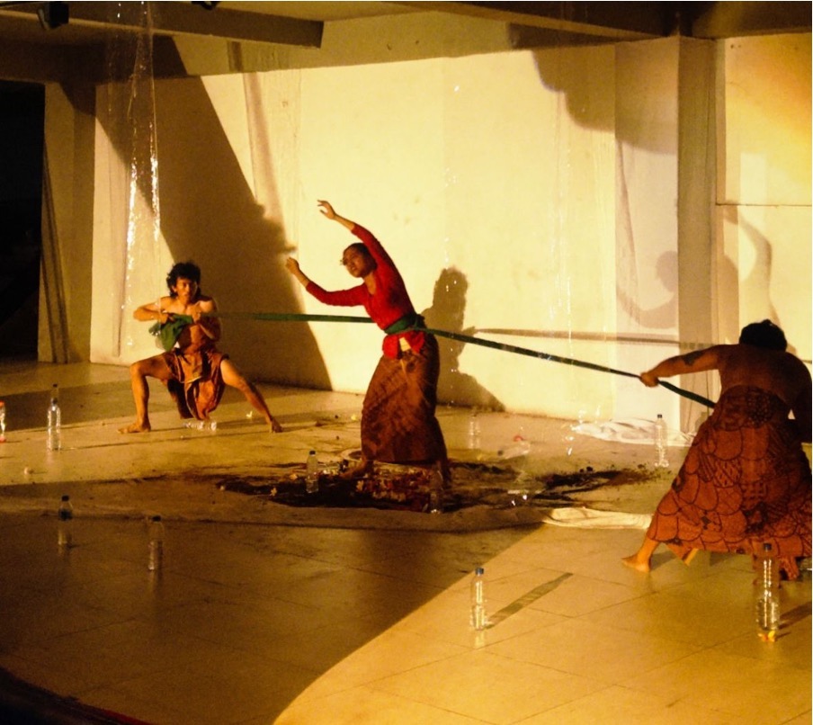Kemudian aktor lainnya menyusul satu persatu mengelilingi Reni yang bersimpuh di sentral lantai pertunjukan, mulai dari De Gung yang menggelar sebuah kain putih yang diuntai begitu panjang, lalu disusul mahijasena yang bergerak merangkai sikut gegulak, yaitu konsep ukuran arsitektur Bali yang diperoleh dari ukuran anatomi tubuh manusia—mengisyaratkan tentang ikatan mengenai tanah, bangunan dan lahan yang terus bergerak sejengkal, demi sejengkal. Lalu berlanjut pada Oka Pratama yang berputar-putar disekeliling area gelaran mencoba untuk memindah botol-botol air yang saling tersusun acak.