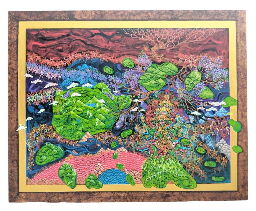 Yang menarik, Pandya juga memberi perhatian khusus pada bingkai lukisan. Ia ingin melihat seluruh pengetahuan dalam bingkai tradisi Bali. Maka bingkai tidak lagi terpisah sebagai objek kayu, melainkan dilukis langsung di atas kanvas. Bingkai menjadi bagian dari narasi visual, menegaskan bahwa tradisi bukanlah pelengkap, tetapi struktur kesadaran itu sendiri.