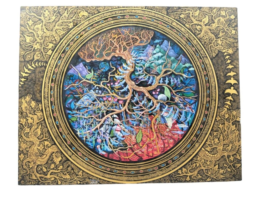 Warna biru dan hijau pada lukisan mendominasi, memberi kesan kedalaman batin dan ketenangan. Di antara akar dan cabang, muncul burung, awan, Hanoman terbang, dan manusia-manusia yang terus bergerak seirama tarian kosmik. Lukisan ini terasa seperti peta semesta batin, tempat berbagai pengalaman—indriawi, emosional, spiritual—saling terhubung.