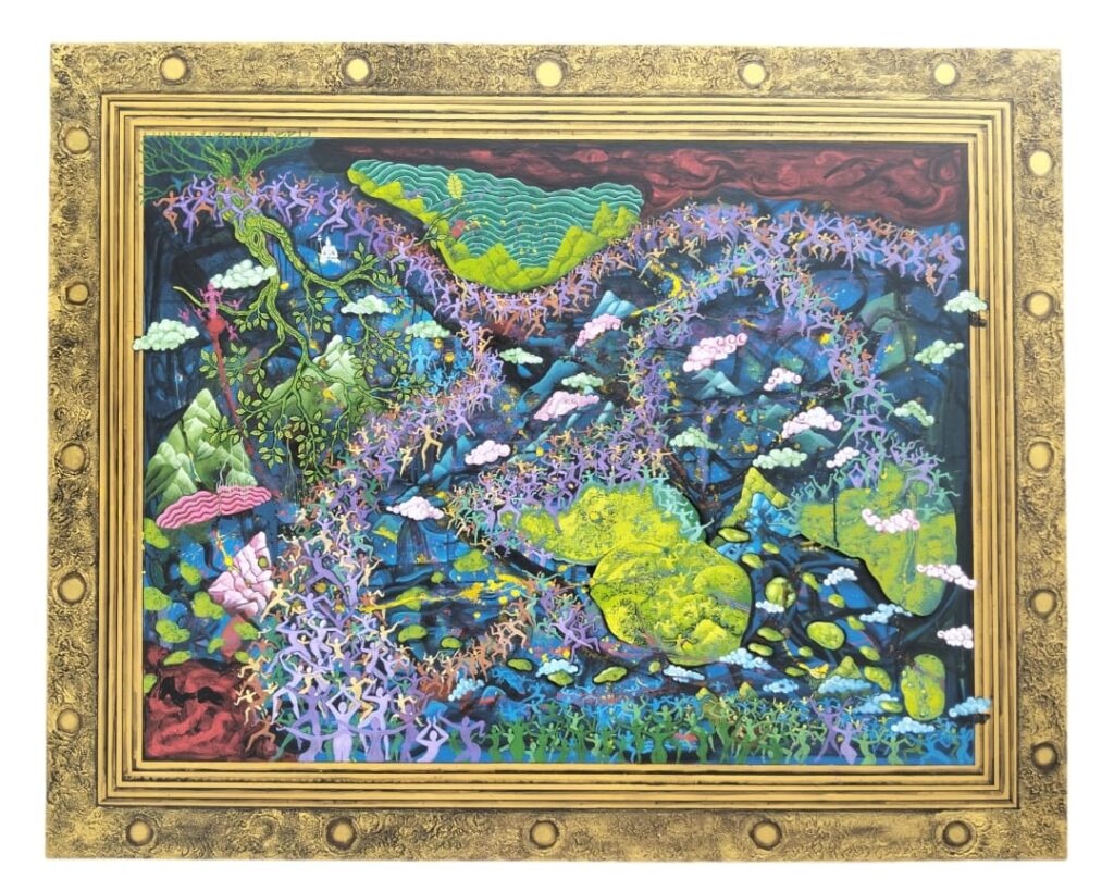 Pada karya “Pohon Aswatam dan Dinamika Kosmik” (200 x 160 cm, akrilik di kanvas, 2025), Pandya menampilkan komposisi yang lebih cair dan dinamis. Pergerakan figur manusia semakin terasa, seolah arus karma semakin deras. Pohon Aswatam tidak lagi tampil sebagai struktur tunggal yang dominan, tetapi sebagai jaringan yang menyatu dengan lanskap kosmik.
