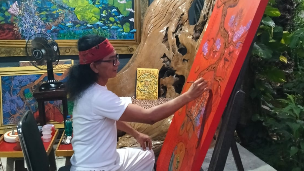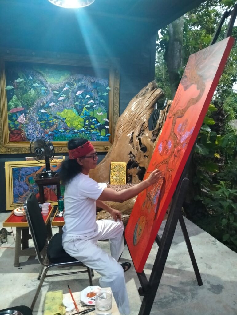 I Putu Wirasa Pandya (Śrī Mahāprabhu Prahlada Pandya) sedang melukis di studionya di Tegal Mengkeb, Tabanan