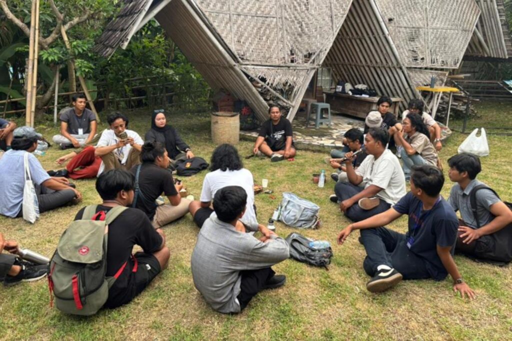 Sebagian dari kami mulai membicarakan rancangan awal karya yang kelak akan diwujudkan, sementara yang lain masih larut dalam pertukaran cara pandang mengenai pengalaman di daerah masing-masing—tentang tradisi, konteks sosial, hingga praktik artistik yang mereka hidupi sehari-hari, membuat perjalanan tiba-tiba terasa terhenti—atau memang harus dihentikan—karena kami telah sampai pada tujuan.