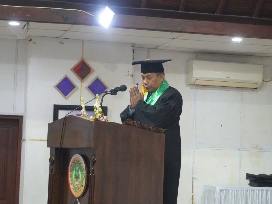 Pengukuhan berlangsung dalam Rapat Senat Terbuka di Auditorium Redha Gunawan, UPMI Bali. Sedari pagi, ruangan itu sudah dipenuhi civitas akademika dan tamu undangan. Suasana terasa khidmat nan hangat. Rangkaian acara dibuka dengan Tari Mahadewa ─ tari kebesaran UPMI Bali ─ yang dibawakan lima mahasiswa Program Studi Pendidikan Seni, Drama, Tari, dan Musik (Sendratasik). Geraknya tegas dan ritmenya tertata, menjadi pembuka yang tepat bagi sebuah upacara akademik yang sarat makna.